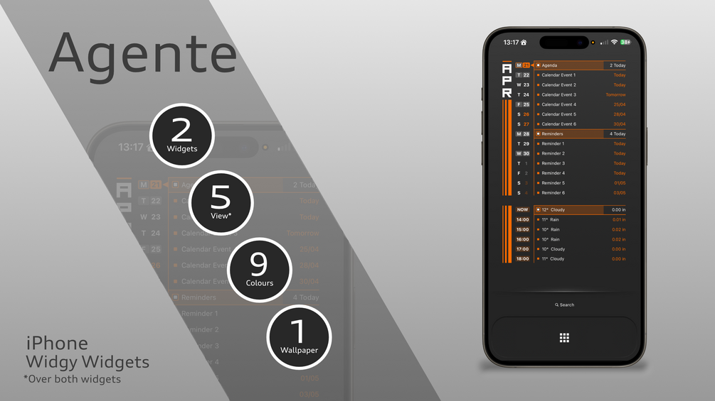 A large widget providing a 2-week calendar, agenda events, reminders and app launchers! and a medium widget providing the current and next 5 hours weather along with 5 more app launchers. Available in 9 colour options!