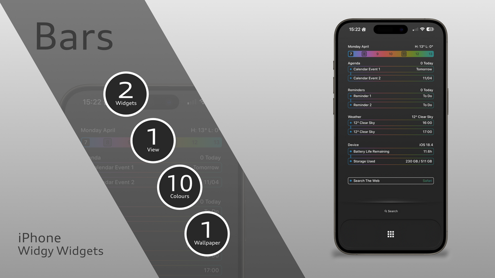 A large widget providing the current date, high/low temperatures, weeks calendar, 2 agenda events, 2 reminders, and the next 2 hours weather. The medium widget shows your device battery hours left, storage space remaining, and a web search bar. Available in 10 colours options!