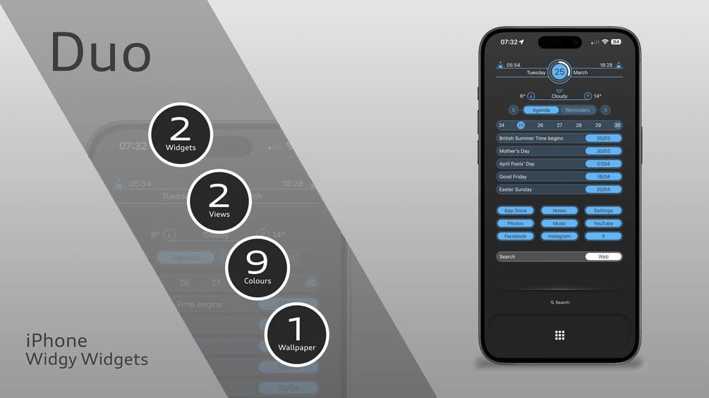 A large widget with 2 views, and a medium widget with 9 launchers and a web search bar for your iPhone.