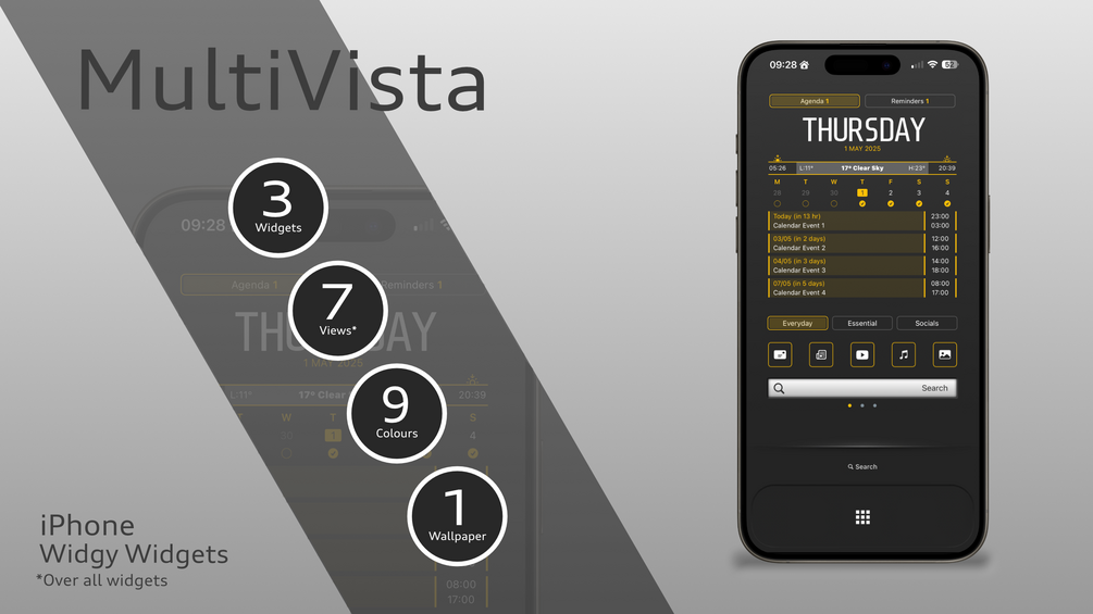 A large widget providing agenda and reminders information over 2 views, and 2x medium widgets, one providing 15 app launcher and the other providing weather information. Available in 9 colour options!