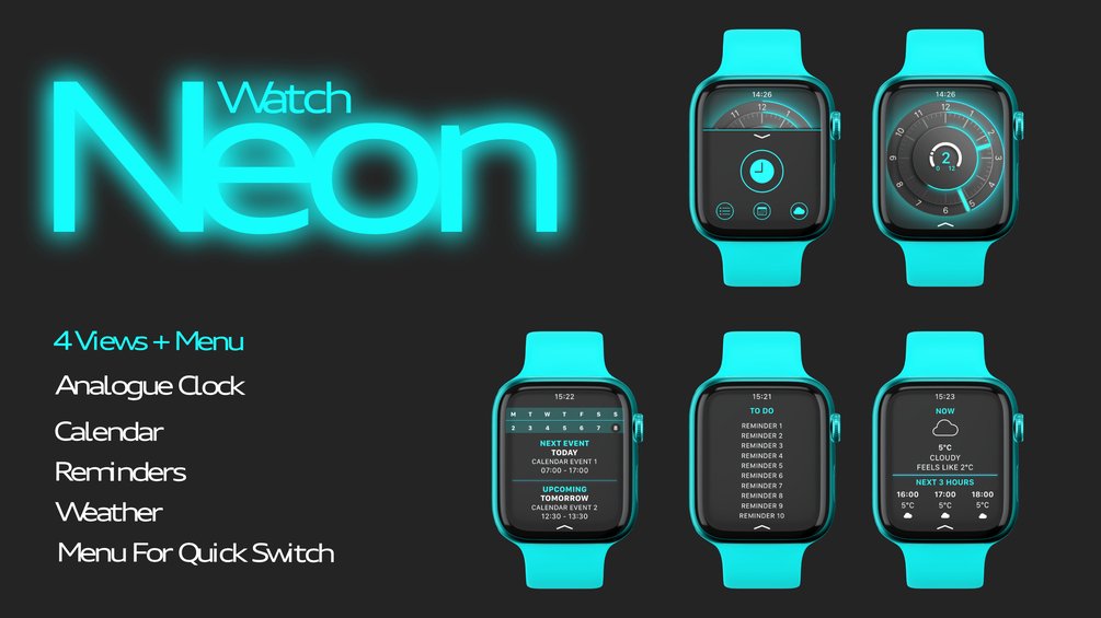 Inspirationally taken from my popular rOund widget, welcome Neon, for your Apple watch, with a futuristic Neon looking Analogue Clock.