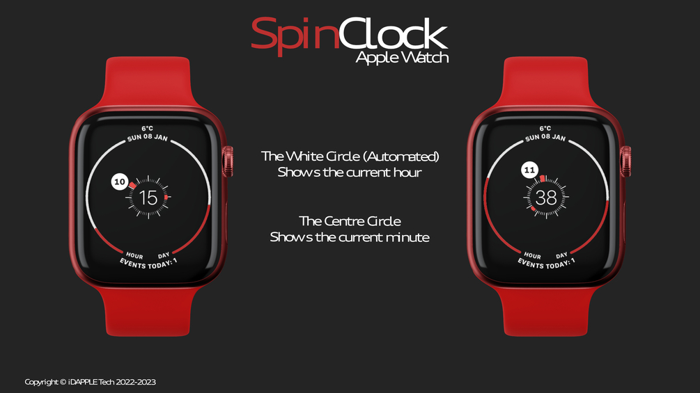 The analogue clock has a central circle which shows the current minute, whereas the White hour circle will automate throughout the day, spinning around the central circle, only showing the current hour.