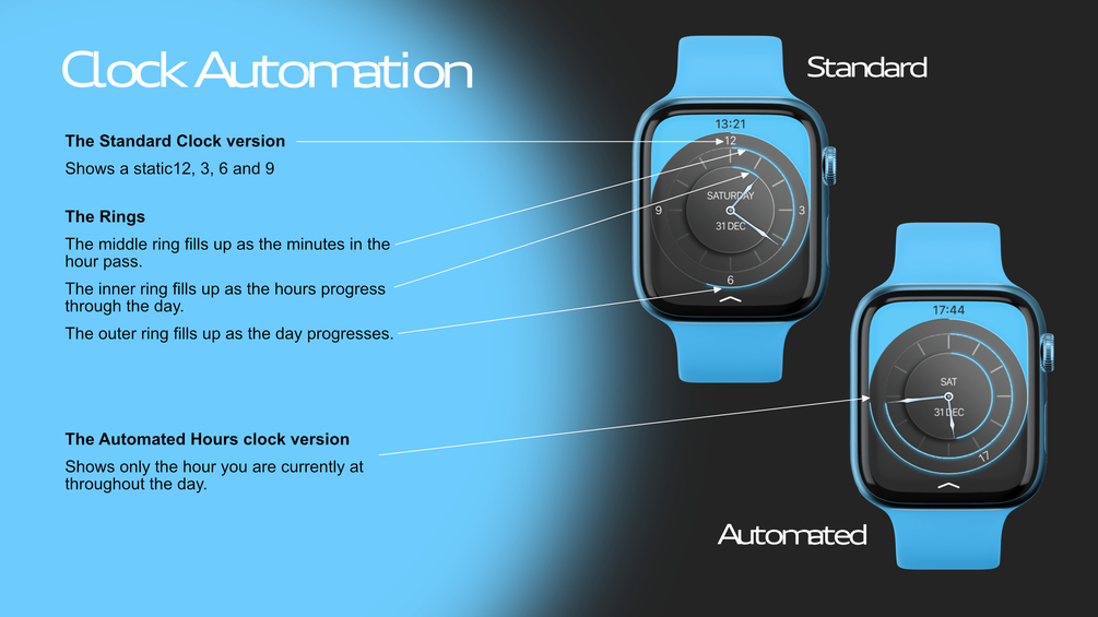 Shows an analogue clock face with moving glowing bars around the circle, which slowly fill through each minute, hour and the progress of the day. The digital time and date are also shown.